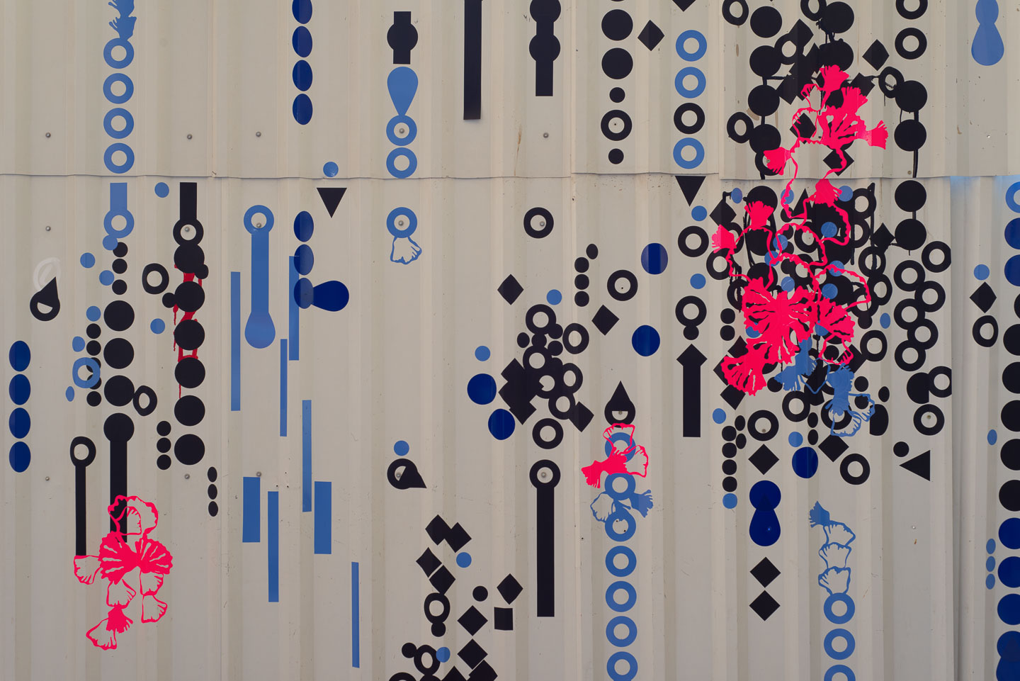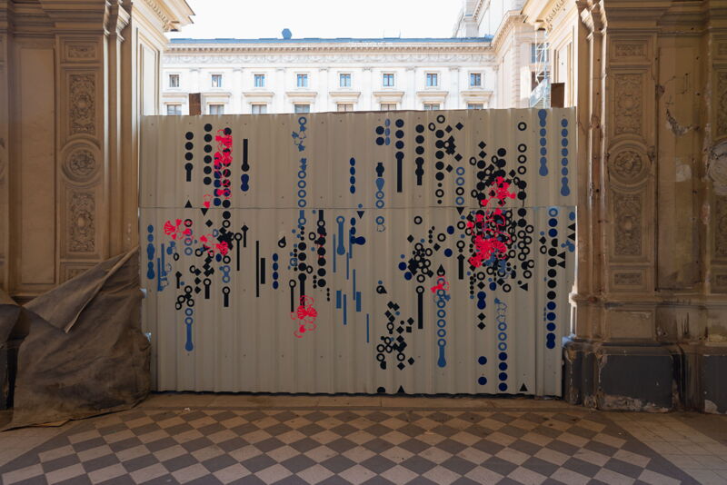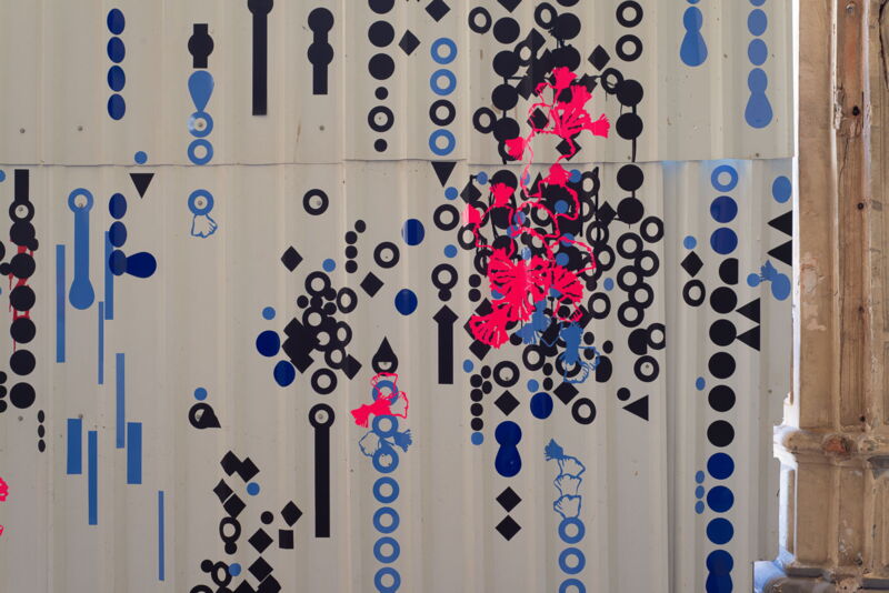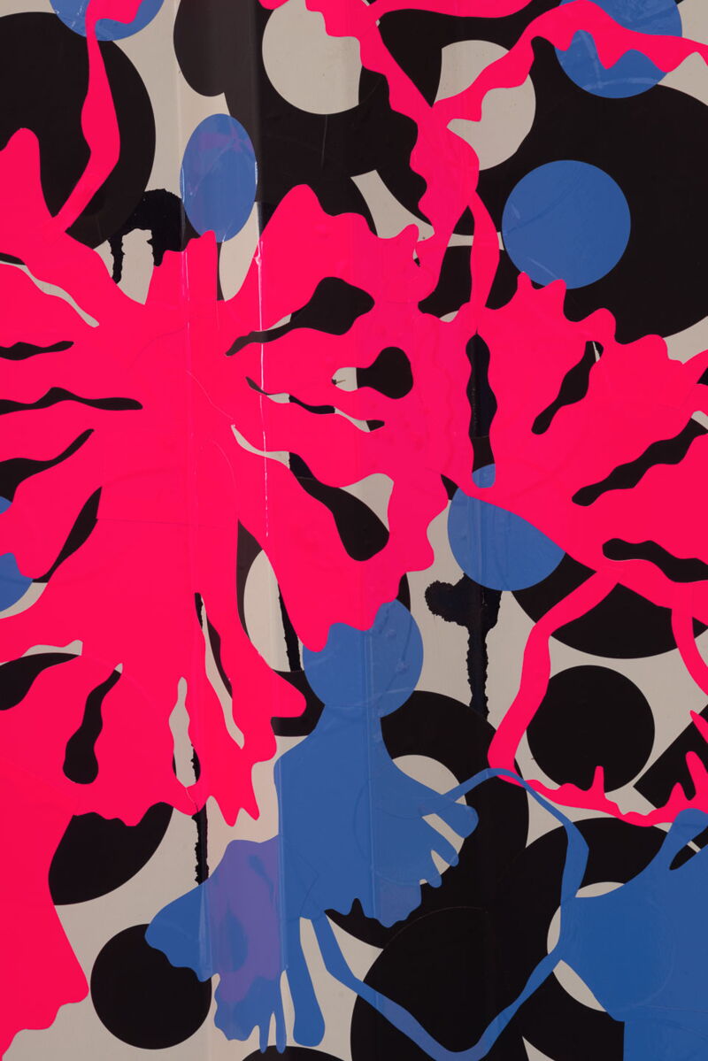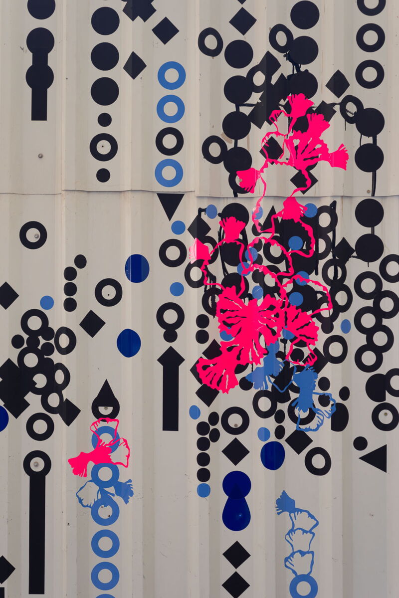 Ein leuchtendes Neonpink auf grauer Fläche. Punkte, die sich durch die Linien eines Bauzauns ziehen. Graffitireste, die durch geplottete Formen wie Adern hervorblitzen.