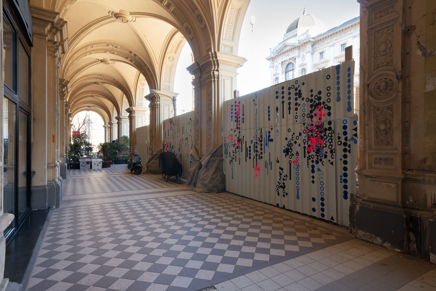 Anne Brachts Kunst am Bau auf Wänden von Geschäften, Schulen, Kirchen, Hotels, Bibliotheken und jetzt: am Bauzaun vor dem ifk erkundet stets konkrete Räume und die mit ihnen verbundenen Topoi. TAPE_ART entsteht vor Ort, im Wechselspiel mit den realen Gegebenheiten und kulturellen Imaginarien.